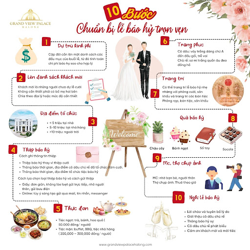 Chọn ngày giờ và địa điểm tổ chức phù hợp Tùy vào số lượng khách mà bạn có thể lựa chọn các địa điểm tổ chức phù hợp. Tiệc báo hỷ thường được tổ chức tại không gian ấm áp như nhà riêng, nhà hàng hay không gian ngoài trời. Các cặp đôi nên xem xét ngân sách để lựa chọn địa điểm và cách thức tổ chức phù hợp.